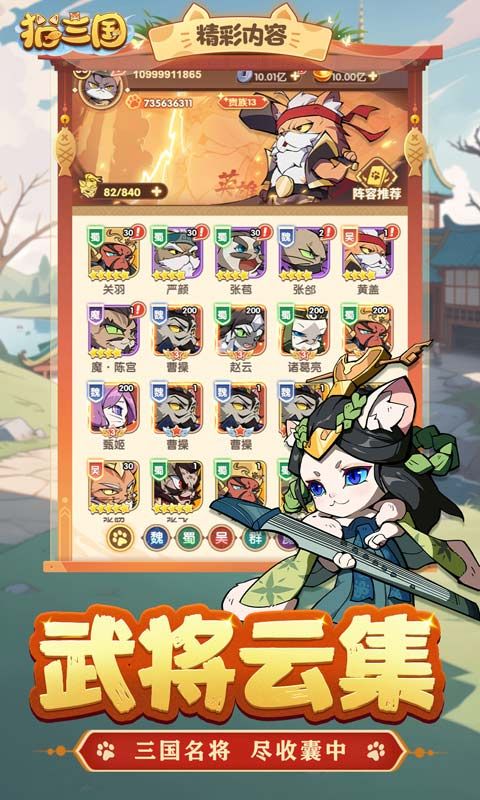 《猫三国》是一款融合战斗、培养、萌宠、挂机等元素的卡牌游戏,游戏讲究布阵和策略技巧,以休闲的剧情和挂机推图玩法为核心体验,随玩随停又轻松解压。在这里,每一次出手、每一个决策都充满意义;在这里,你将探索无尽的冒险之旅;在这里,你将与传说中的英雄们并肩作战,共同书写不朽的三国史诗!