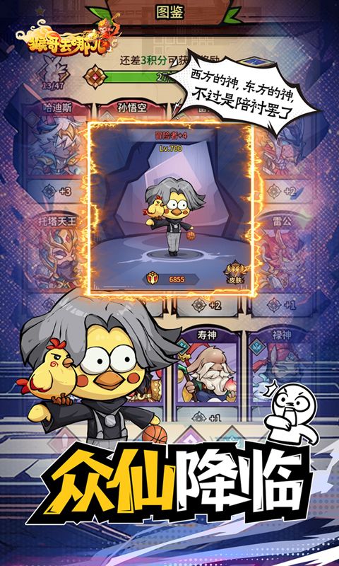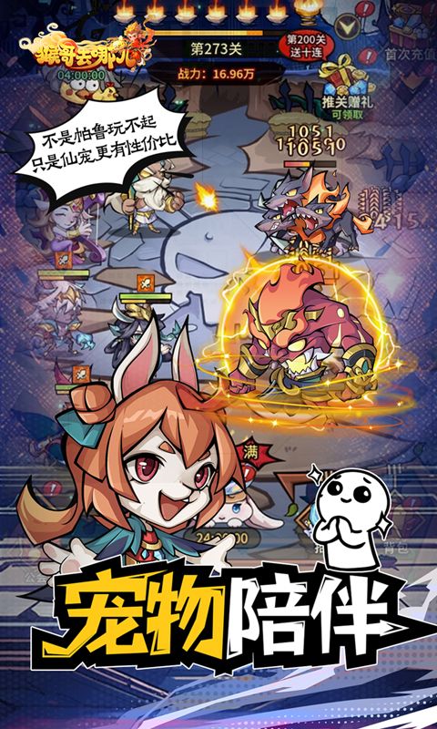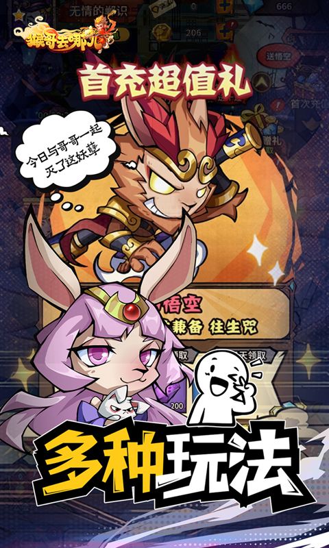 《猴哥去哪儿(0.1折坤坤突鸡)》是一款挂机类休闲游戏,2024年我误入仙界,睁开眼睛便看见猴哥盯着我看,小声的问我没事吧,环顾一周发现了不少熟悉的面孔,不过画风似乎又与我不同,在我差异之际,前方冲过来不少魔物,刹那间只见身边的仙人们整装待发,决定于魔物决一死战!游戏中我们操控着众多熟悉的角色,例如孙悟空,后羿,嫦娥等等神仙,通过对其排兵布阵抵御魔物的入侵,同时我们需要不断的提升自己的等级,才能最大限制的提高角色的战力,我们要做的不单单是点击屏幕,还需要熟知每个角色的技能,将不同角色进行搭配组合,创造出一支战无不胜攻无不克的阵容!