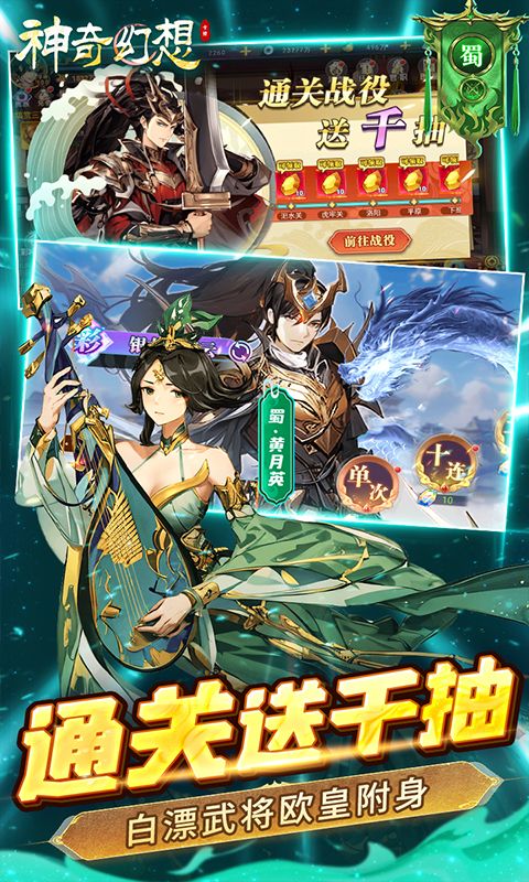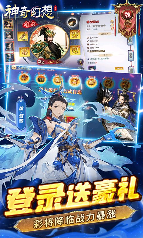 《神奇幻想》百种武将搭配最强福利加强版三国卡牌手游来了!全部充值永久0.1折!上线送贵族6、3888个转生精华、10000代金券、8888元宝。送无限真充,免费充值触发每日累充,每日礼包免费刷!通关战役送千抽,七日登录送神兽、酷炫幻化、自选红将、自选彩将!