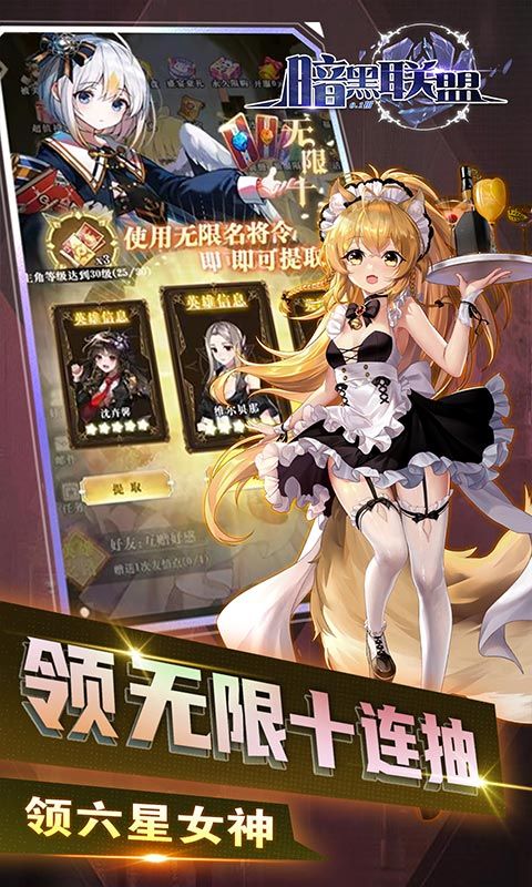 《暗黑联盟(少女联动爽抽0.1折)》一款不肝不氪、抽卡暴爽、人人都是欧皇的放置类卡牌手游、经典女神将以更唯美的形象重现、集结全球顶级画师打造游戏卓越画面表现、韩式写真立绘令人惊艳、动漫感十足的场景尽显主机级游戏 场景品质,原画柔和精致,更有动态场景带来的生动酷炫的战场效果,集结女神开启异世界裂缝之路~
