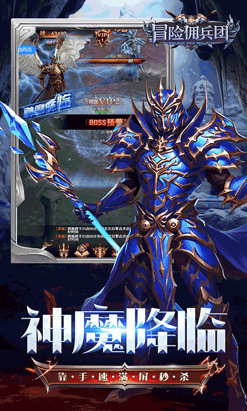 《冒险佣兵团(0.05折MU神魔打金)》还原经典魔幻世界!战法弓三大职业任君选择,快化身救世勇者,书写你的传说! 闯关直升VIP10,华丽翅膀、炫酷神魔、强力佣兵在线即得!玩法简单易上手,福利满满享不停! 在线PK刷Boss,离线照样能升级! 多种跨服玩法,自我突破永无止境! 三大职业风格迥异,技能炫酷秀翻全场!绝对是你从来没体验过的
