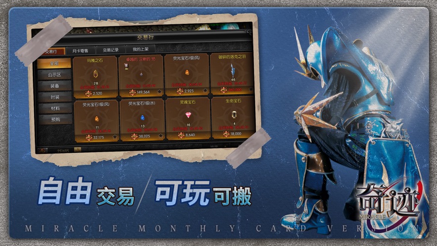 "一款纯绿色奇迹手游,主打自由交易,装备养成全靠手打,轻松娱乐。一张月卡畅快体验所有游戏内容