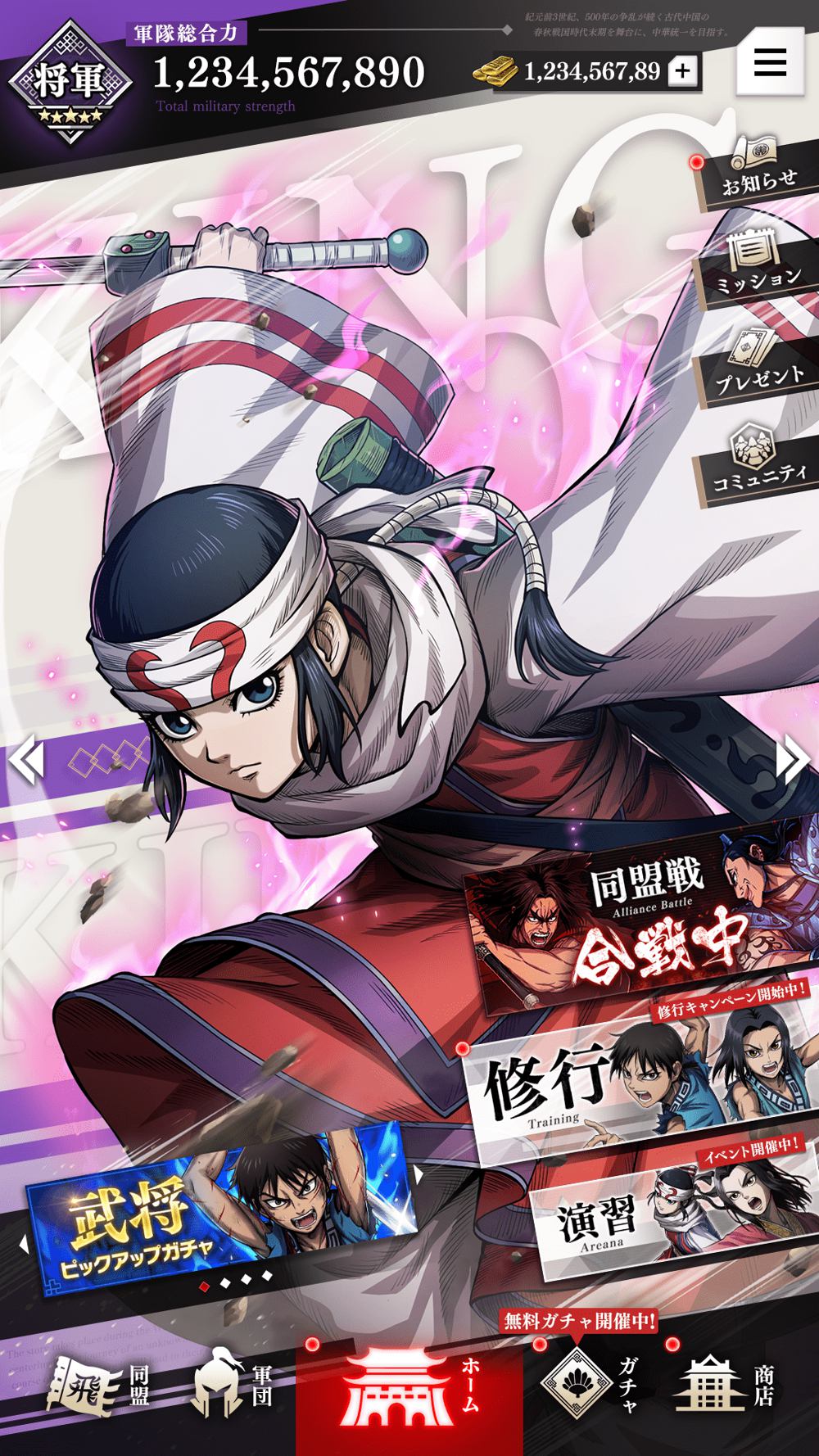 动画《王者天下》的原作是於《週刊 YOUNG JUMP》连载中,原泰久笔下的人气漫画作品,以中国的春秋战国时代作为背景,作品描述秦国中立志成为大将军的年轻人「信」,因故被捲入春秋战国的秦国宫廷内斗,他与另一名青年「嬴政」(即后来的秦始皇)两人活跃的故事。 官方表示,《王者天下 顶天》是《王者天下》推出的第五款手机游戏,以养成模拟、即时公会战为主要玩法。游戏中,主角将化身练兵家,获得、养成《王者天下》中登场的武将们,率领培育的武将组成最强军队,击败强敌的大军,以夺下中华为目标。