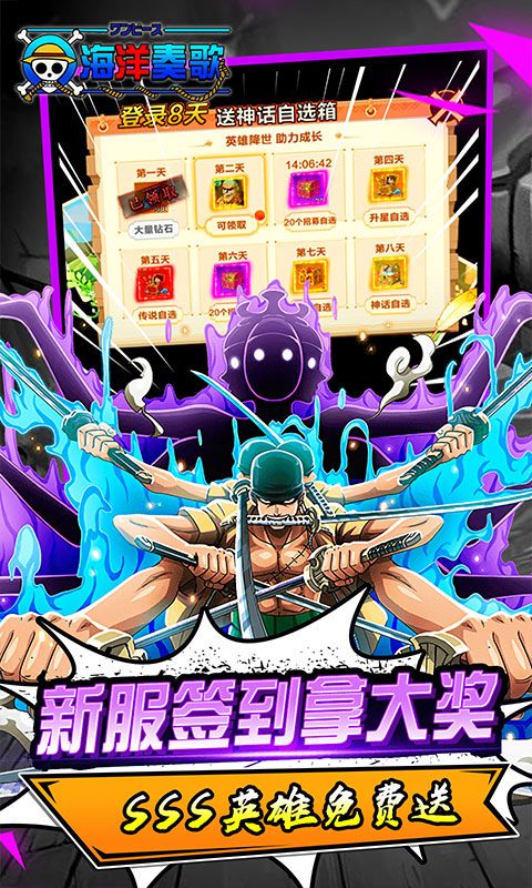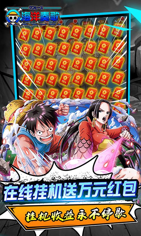 《海洋奏歌(0.1折也要送万充)》是一款正版授权的海贼高质量挂机卡牌游戏,原版数值,拒绝膨胀!首续充值0.1折,充值比例1:10;上线赠送钻石*8888,强者招募令*20;首日起,在线累计赠送万元充值卡;登录福利,签到八天送sss海贼英雄和百抽招募券;冒险闯关重启大航海世界,见证新世界崛起之旅!