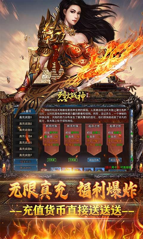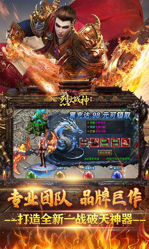 《烈火战神(破天神器无限刷充)》散人福利七天登录千万元宝拿到手软!主线任务,打怪也能爆真充!福利拉满良心制作,必买限时抢购,原价2688,现在只要108打包带回家!高阶道具超强装备炫酷外观和称号,更有逆天属性buff,开局直接称霸全服!剧情炼丹玩法,极致体验超爽提升,跨服boss、神装大爆、超新专属、激情无限!