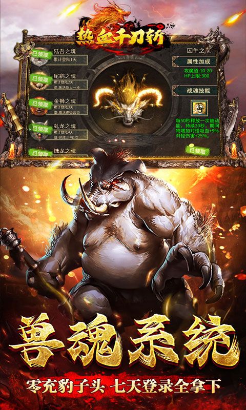 《热血千刀斩》——重燃战斗激情,铸就传奇辉煌!登录豪礼,畅享无忧征途! 即刻加入,尊享登录福利——自动回收与自动拾取功能,让资源积累轻松自如。更有对怪吸血提升2%,怪物爆率激增50%,搭配怪物切割强化30%,让你的征途所向披靡。连续七日登录,七大兽魂震撼登场,助力你问鼎巅峰!特色兽魂系统,守护你的传奇之路! 独创兽魂召唤机制,能成为强者。七天内,所有兽魂唾手可得,它们将化为你的护盾,伴你征战四方。将魂系统,重塑古代战场神话! 每召唤一位传奇武将,即解锁一项独特技能。策略搭配,智勇双全,让你的每一次战斗都威力倍增,策略与力量的完美融合。回忆经典,实物回收百万宝藏! 游戏内置实物回收系统,昔日珍稀道具不再是梦,重温复古情怀,海量宝藏等你发现。七大怀旧大陆,隐藏彩蛋遍布! 穿越至数百种专属地图,体验丰富剧情的同时,揭开一个个隐藏彩蛋,每一次探索都是一次新奇冒险。