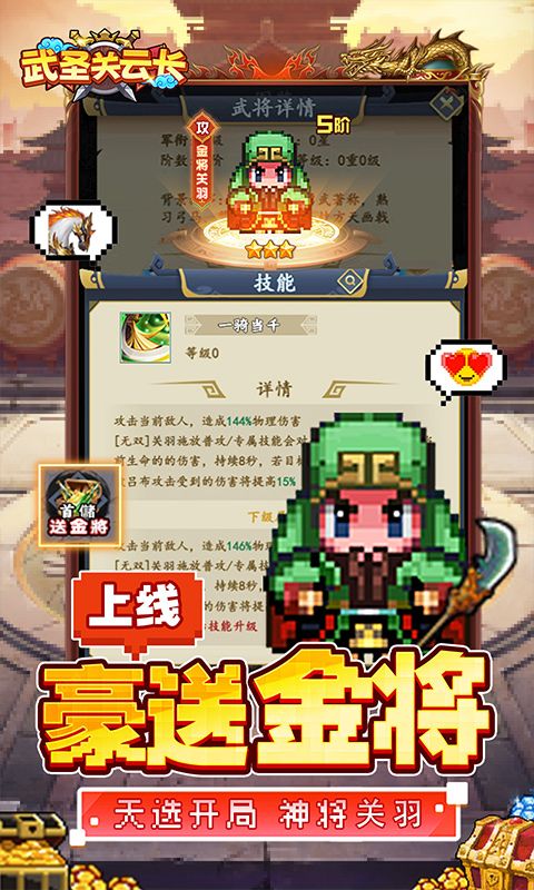 《武圣关云长(内置0.05折送金将关羽)》每一个人心中都有一个英雄梦,每个人都幻想自己身处乱世当中会如何功成名就,《武圣关云长》传承经典系统的同时,创新游戏玩法,乱世风云,烽火连天,英雄辈出,无论是攻城略地,还是智慧谋略,都可以让你带领三国文臣武将一统天下,由一位建功立业的小兵开始,从汉中之战直至一统天下,建立属于自己的小兵传奇,数十种武将技搭配,丰富的宝物装备,各种副本任务,各种不同玩法给你带来耳目一新的感觉,快来建立属于你一统天下的霸业!