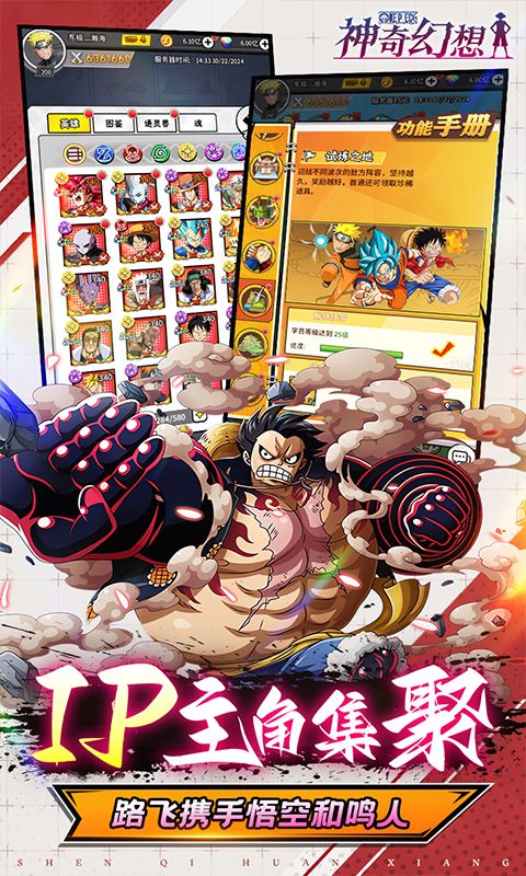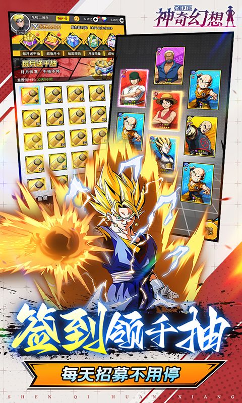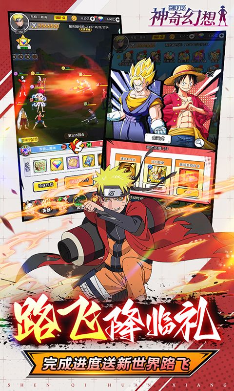 《神奇幻想(动漫联动0.1折)》0.1折经典IP梦幻联动,海贼与龙珠火影联动!上线送UR英雄福利自选,充值永久0.1折!IP主角热血集聚,路飞携手悟空和鸣人!路飞降临,完成进度送新世界路飞。还有七日目标送超赛神悟空。更有累计签到送千抽,每天招募不用停。经典动漫极致还原,超百位英雄,佛系挂机休闲护肝,挂机开箱永不停歇!