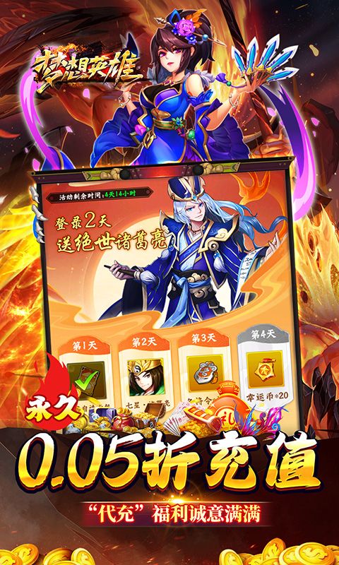 《梦想英雄(0.05折福利送充)》是一款全新三国题材策略卡牌手游,真实还原剧情,争霸天下,攻城掠阵,融入众多历史名城以及经典战役元素,超然万物的名将助您角逐三国之巅。0.05折的价格,升级即可领取代金券,更有海量福利,丰富活动,等主公您体验。畅享无双豪情~