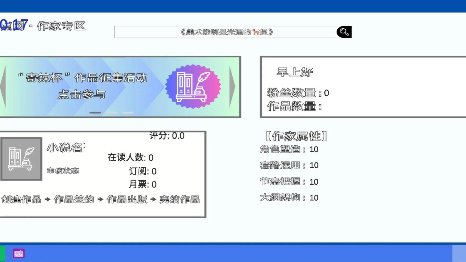 《网文帝国》是一款模拟经营游戏,让你化身为一位网文集团的创立者,从零开始打造自己的文学帝国。招募作者、管理团队、运营网站,每一步都考验你的策略和决策。在这个文字的世界里,你将体验到创作的激情、运营的挑战和版权的博弈。准备好了吗?让我们一起在网文的海洋中乘风破浪,书写属于你的传奇!在数字化时代,文字的力量不容小觑。《网文帝国》是一款模拟经营游戏,专为那些梦想着在文字世界中留下自己印记的玩家们设计。你将扮演一位网文集团的创立者,从零开始,一步步建立起自己的文学帝国。游戏背景设定在一个充满挑战与机遇的虚拟世界。你的目标不仅仅是建立一个网站,而是要打造一个充满活力、才华横溢的作者团队,创作出引人入胜的作品,吸引成千上万的读者。你的决策将直接影响到集团的兴衰,作者的成长,以及作品的成败。