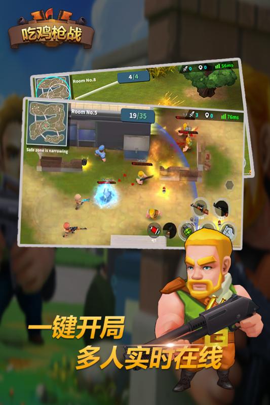 随时随地,都能打起来! 《吃鸡枪战》是一款非常有趣Q版枪战求生大逃杀游戏,游戏场景独特有趣,枪械道具任意切换获取,场场开局都不同!可以简单粗暴就是干,也可以灵活走位秀操作!自由自在,随时开黑的团体枪战,秒进游戏秒开团!