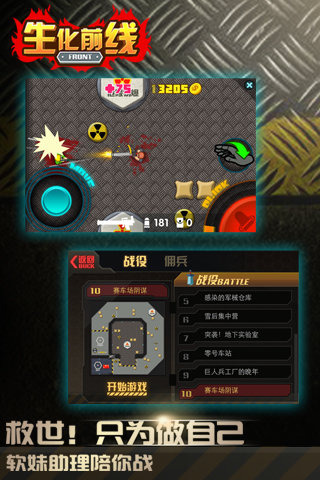 《生化前线》是一款爽快的动作射击游戏,游戏中你将面临众多怪物的挑战,需要运用各种武器,宝物和升级技能来取得战斗的胜利,操作简单,易于理解,玩家只需一只手利用虚拟摇杆控制操作主角的上下左右移动,另一只手点击屏幕进行射击。