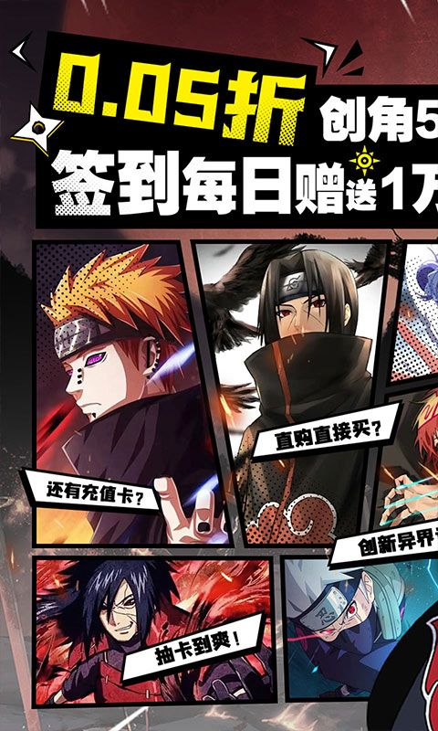 《异次元大作战(0.05折百万代金版)》是一款正版横版火影卡牌游戏!游戏内真实还原了旋涡鸣人一路成长的历程,一路挑战各个关卡,收入各个动漫里面脍炙人口的人物作为自己的伙伴,一起征战忍界!新版百万代金版本强势来袭,上线就送5万代金券+神话忍者自选*6,直接成就神话小队;游戏内还有波风天人等四个本游戏自创万能忍者,阵容搭配更加灵活。各种PVP、PVE等玩法,让手指根本停不下来,这个火影手游很有意思,快来加入我们吧!