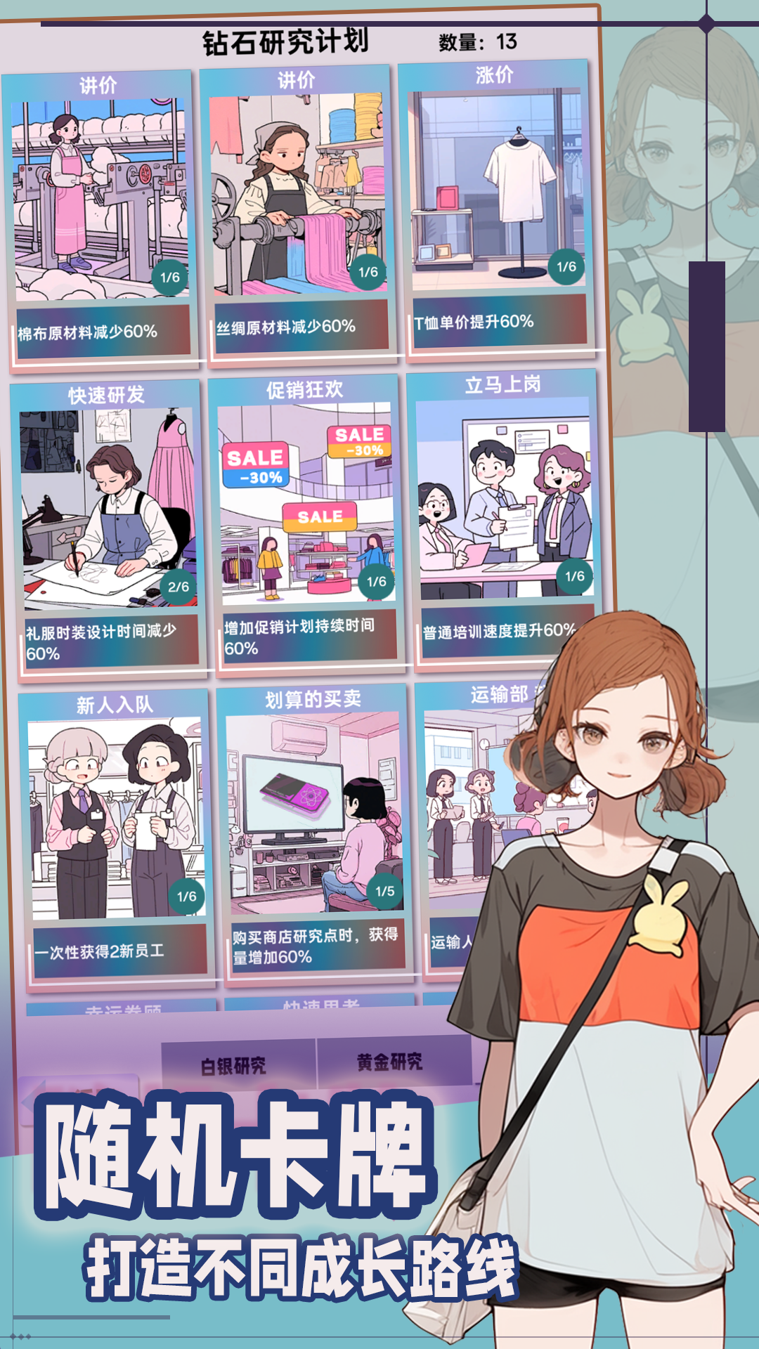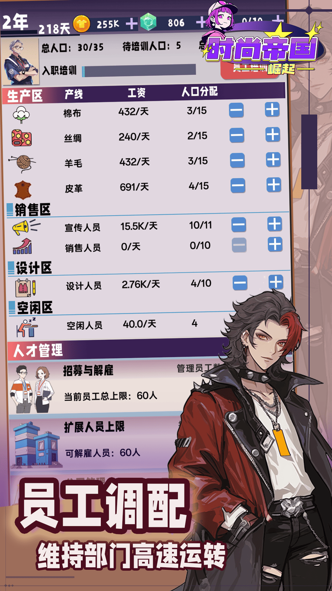 《时尚帝国:崛起》——模拟经营+肉鸽卡牌的放置游戏。在这里,你将化身时尚行业的造梦者,从一间小小的工作室起步,用智慧和策略编织属于你的商业蓝图。经营策略,步步为营- 规划生产线,平衡原料采购与订单交付节奏- 招募精英团队,调配设计、生产、营销的黄金三角- 投资科技研发,用智能化和可持续材料抢占先机- 在全球都市购置地产,打造地标级时尚总部创意与商业的平衡艺术- 设计数百款服装:简约T恤、奢华礼服、机能工装…用风格征服市场- 应对行业挑战:原料波动、员工培训、竞争对手的明争暗斗- 定制公司制度:高福利留住人才?还是高压激励创造奇迹?世界级时尚版图由你书写从本地裁缝店到跨国集团,每一次决策都推动帝国成长。参加国际时装周、并购竞争对手、引领环保潮流…最终,让全球橱窗都陈列你的设计!轻松上手,深度策略清新明快的画风搭配烧脑经营系统,既能享受放置收益的悠闲,也能沉浸于精密规划的乐趣。点击开始,打造你的时尚传奇!