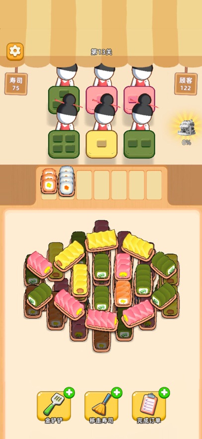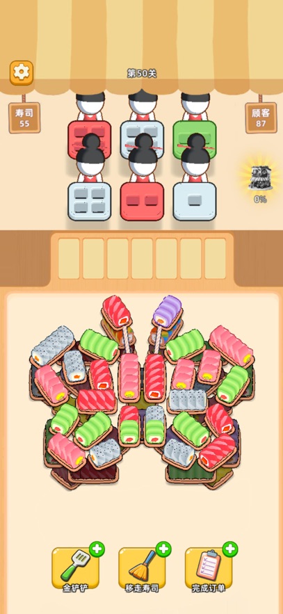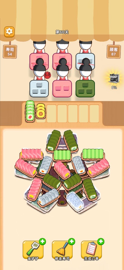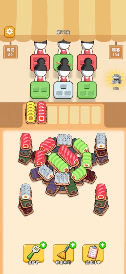点击寿司,将它移动到对应的位置,准备好给服务员上菜!服务员需要的寿司颜色和数量都摆在餐盘上,快速消除他们的需求!每次送对寿司,服务员就会满意地收下餐盘,完成任务。