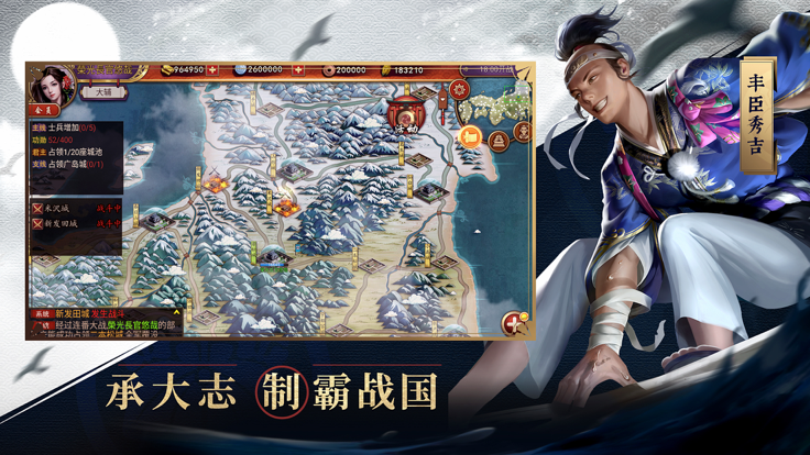 实时策略玩法,轮回制战局让你不断变强,浮世绘风,还原日本战国时期大地图,体验新的剧情,战国名将400以上!游戏中,您将来到日本战国时代,与各位战国大名,招兵买马,或结识盟友,或单枪匹马,发展内政,扩张势力,最终称霸天下。【全新的战场,同一个目标】日式战国时代背景策略手游——战国布武,战国名将,百城大地图,浮世绘风格,体验不一样的战场。还原日本战国时期历史,占领城池,声东击西,不断扩张势力,巩固内政,最终达成统一。【招募天下英豪,成为战国大名】日本战国时期是一个充满传奇的时代。传奇的战役,传奇的英雄豪杰。众多家族,多方势力,汇聚在这里,您可以将他们尽数收入麾下,合理搭配阵容,调兵遣将,获得胜利。【指尖策略,声东击西】轻轻舞动妳的手指,就能调遣百万大军,纵观全局,运筹帷幄,利用策略赢得胜利。武力不行就用智力战胜对手。【远交近攻,算无遗策】想要获得胜利并不是那么简单,有一个盟友则显的非常重要。通过外交寻找一位志同道合的盟友,一起合力获得统一。善于用计可以让妳事半功倍,在计策馆中寻找秒策,让战局变得游刃有余。【是非成败,轮回再论】游戏采取轮回模式。无论您在上一局战斗中获得辉煌战绩,亦或是惜败,您都可以重新开始新的征程,过去的成功和失败将成为宝贵的经验,不断努力,成就自我。曾经失去的,一定不能再丢掉!过去已经到手的,将它们握的更紧!