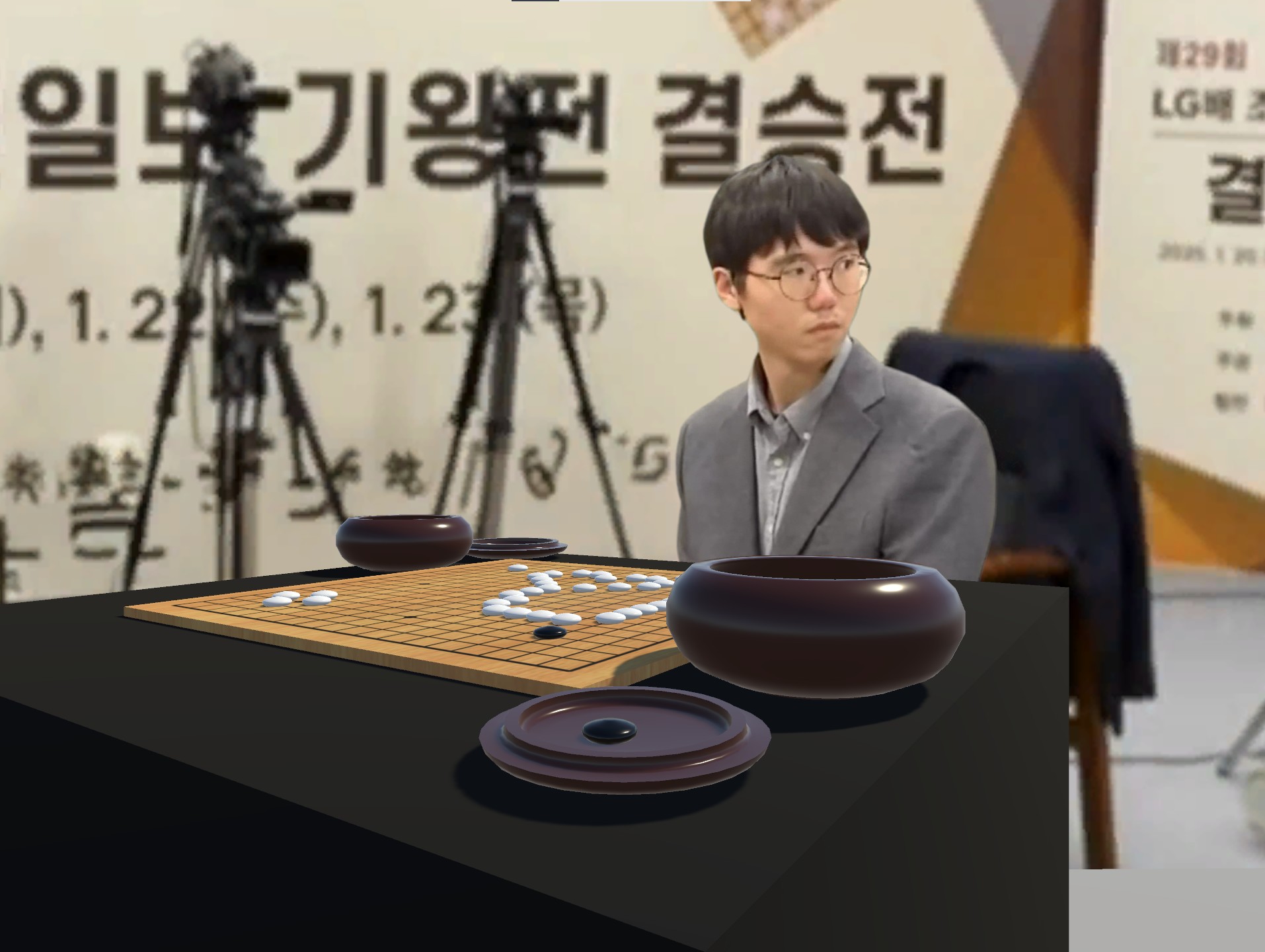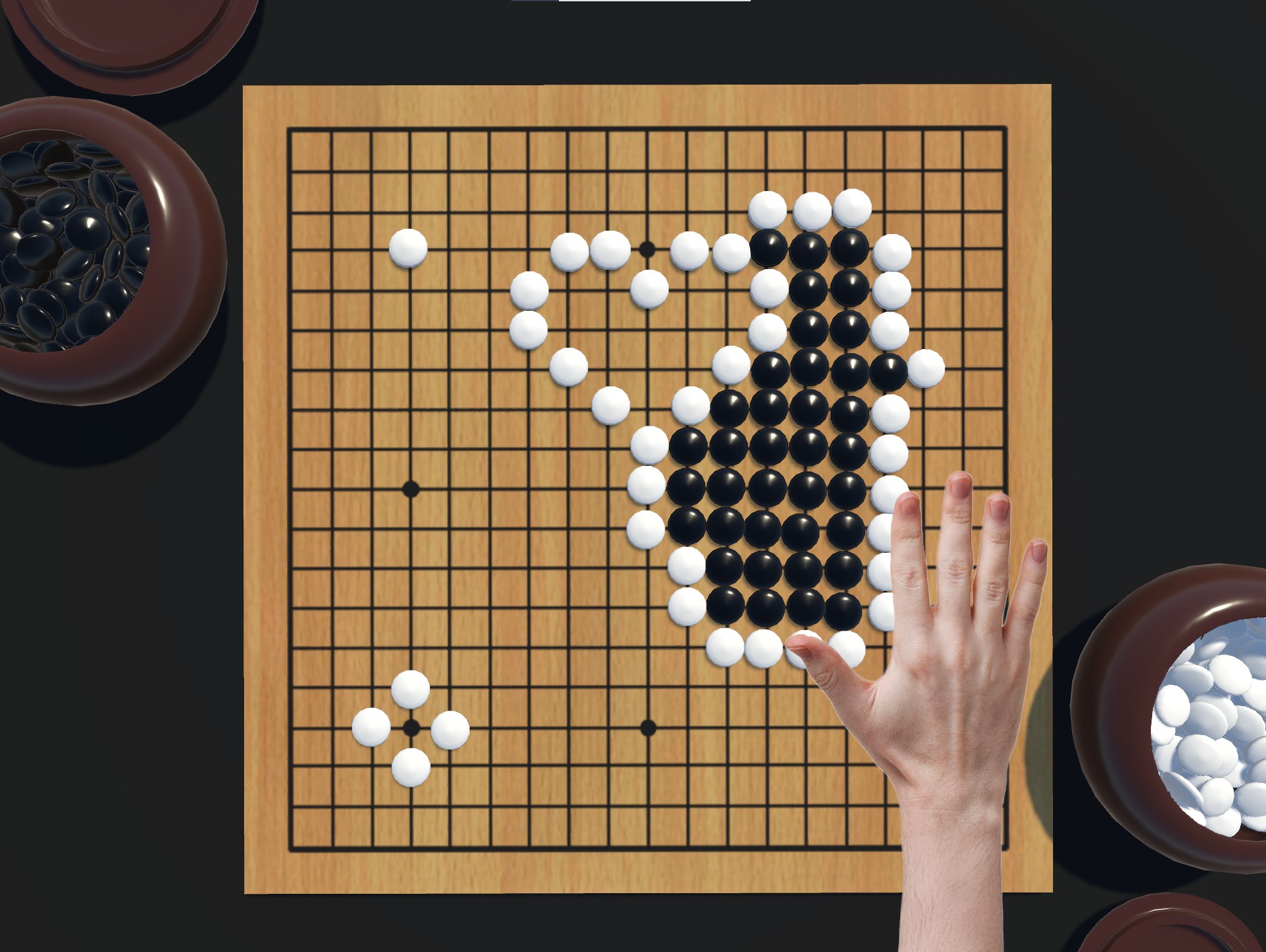破解围棋残局,注意不要让棋子掉到桌子上(韩国围棋规则)。右键旋转视角。左键放旗子, 一共有38颗棋子需要放置。