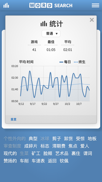 享受单词搜索,这是个有着数以千计免费谜题的经典游戏!尝试我们独特的困难级别和专家级别找单词模式!关于找单词:您的游戏目标是找到这个网格中隐藏着的一系列单词。单词可以是垂直的,横向的,对角线的或者是倒着的。当您发现它们后,可通过滑行并拖动单词的首字母,来在网格中选择单词。若要获得更巨大的挑战,欢迎尝试我们的困难级别和专家级别的找单词模式,配合隐晦的单词列表。我们的益智游戏中使用的所有单词均为标准英语单词,并且比其他找单词益智游戏的词汇库更丰富一些。这让我们的游戏变得有趣,并且是您建立词汇库和学习新单词的方式。点击单词列表中的任何单词,可以查询它在字典上的定义。我们的经典找单词游戏也可以保存您的未完成游戏,所以您可以随时回来完成这些游戏!用我们的统计数据追踪器来记录您的最佳和平均解答时间。您可以在您的手机和平板电脑上玩Razzle Puzzles推出的找单词游戏。在线或离线模式下享受游戏!