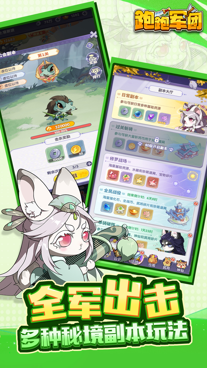 《跑跑军团》——革新策略卡牌手游,指尖轻点横扫千军独创 “三国扭蛋机”战斗系统!战斗开始前,金币抽奖,随机召唤小兵 — 可能是呆萌盾兵、连弩手甚至稀有神将!手指一点就能合成升级: 3个刀兵=铁甲巨盾,防御翻倍扛住BOSS大招!⚡️ 3个弓手=诸葛连弩,弹幕特效秒变割草现场! 欧皇暴击:概率摇出三国神将,吕布一出将化身成敌人的噩梦,横扫全场! 合成策略+随机BUFF,越合越上头战场随机掉落 “兵法盲盒” ,点击开启惊喜:✅ 神技BUFF:抽到“箭雨风暴”秒清杂兵,“火龙卷”烧穿敌阵!✅ 羁绊加成:凑齐“五虎上将”,激活全体暴击率+30%!✅ 逆天combo:冰冻BUFF+攻速翻倍=站着不动也能割草通关!聪明合成才是王道 ——是优先升满前排肉盾,还是赌一把合成后排输出?每一次选择都心跳加速!【视觉革新】养成即蜕变,越战越璀璨角色成长不止于数值提升,更是一场视觉进化之旅: 赵云:白袍新兵 → 银甲龙胆 → 觉醒形态「天翔之龙」 貂蝉:轻纱曼舞 → 霓裳风华 → 终极形态「闭月倾城」⚡️ 短平快战斗:单局3分钟,通勤路上轻松刷10关!* 特效爽炸:合成暴兵铺满屏,技能特效自带“清屏烟花”,解压指数满分! 还原经典战役:• 虎牢关:摇出吕布单挑三英,合成骑兵冲垮敌阵!• 赤壁火攻:合成10个火弓手,一键点燃全场秒杀BOSS! 立即下载,解锁你的三国霸业起点!—— 在这里,每一枚金币的抉择都是战略,每一次合成都是迈向传奇的足迹 ——