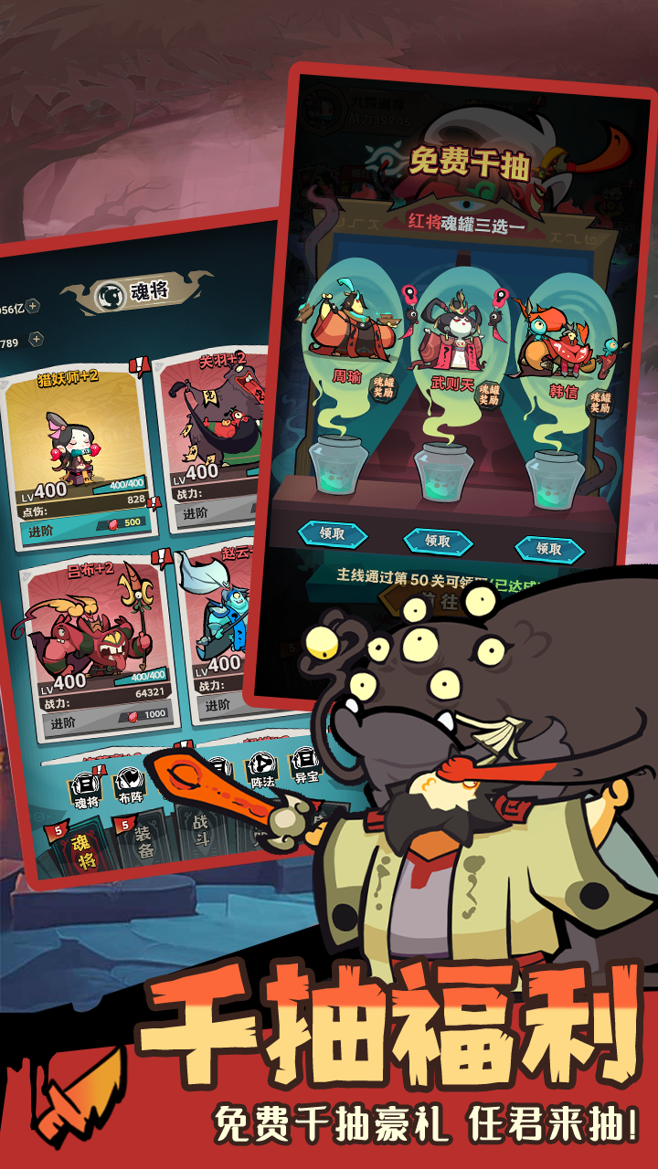 在猎妖村里,您将化身为一名猎妖师,通过收集符咒召唤赵云、廉颇、关羽、吕布等三国名将,化身为魂将为您而战。独特的美术风格和强烈的策略性,让您眼前一亮一亮又一亮。阵容羁绊搭配,稀有魂将培养,您将拥有一只无人能敌的队伍,为您魂定江山,叱咤风云。此外,游戏还拥有锁妖塔、魂域对决、祸乱四起、幽府秘境等丰富多样的特色玩法,简直好玩又有趣。【游戏特色】※战国绘卷黑袍人的阴谋,你做出的抉择,都将引领剧情走向不同的分支,而你也将在这个过程中不断成长,书写属于你的战国篇章。※烧脑对决不同的武将都有着专属的技能,通过将他们进行不同组合来搭配出最强阵容,根据场上局势不断调整你的策略,战胜你的敌人。※联盟争霸加入一个强大的联盟,你就不用担心孤身作战,与你的盟友一同攻城略地,为了集体的荣耀而战,感受热血澎湃的多人对决。※武将培养你可以在这里收集并培养许多的武将,他们每一个人都各具特色,你可以为他们打造各式各样的装备和道具,通过你的培养,你的武将可以不断提升实力。※轻松挂机无需硬干,小鬼异火还会自动为你攻击,解放双手,轻松挂机,超多福利随机送