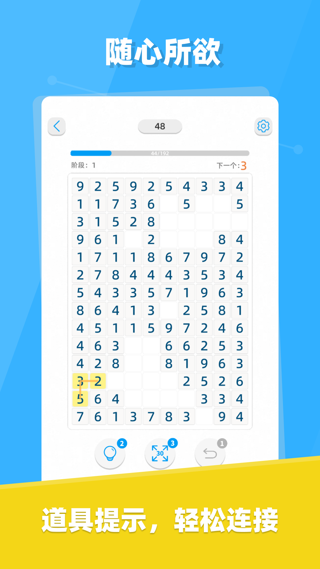 Number Match X 是一款引人入胜的益智游戏,规则简单:连接数字,使它们的总和恰好等于 10,并清除所有数字方块即可获胜。挑战自己,努力刷新个人最高分吧!## 玩法说明目标是清除整个数字网格。在网格中找到相加等于 10 的数字对(例如 1 和 9,3 和 7,或 3、4 和 6)。滑动连接这些数字方块,将其消除并获得积分。你可以水平、垂直或对角连接相邻的数字。当没有可用的匹配时,你可以添加新的数字到网格中。如果卡住了,可以使用提示功能来加快进度。当所有数字都被清除时,你就赢了!解谜的方法有很多,但并不像看起来那么简单。挑战你的大脑,享受解谜的乐趣吧!** 挑战你的脑力,尽情享受 Number Match X 益智游戏的乐趣!随时随地畅玩数字游戏! **