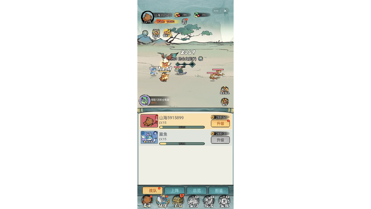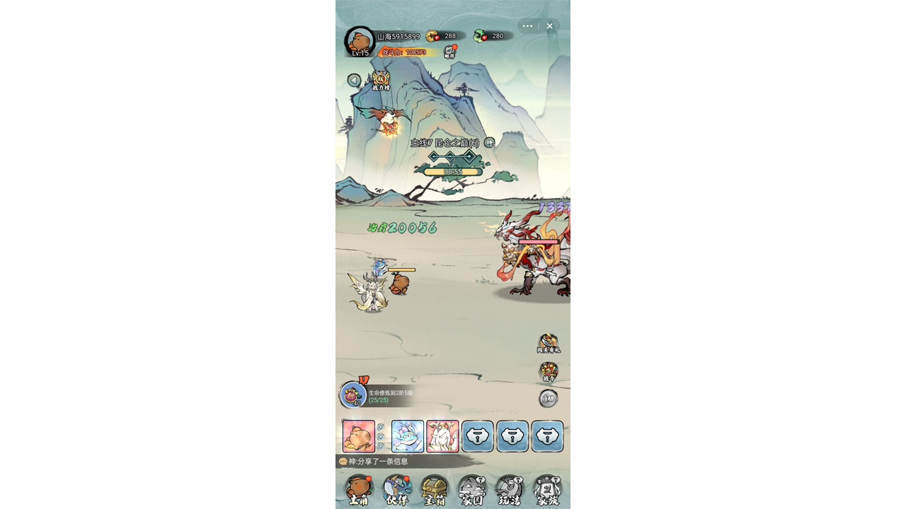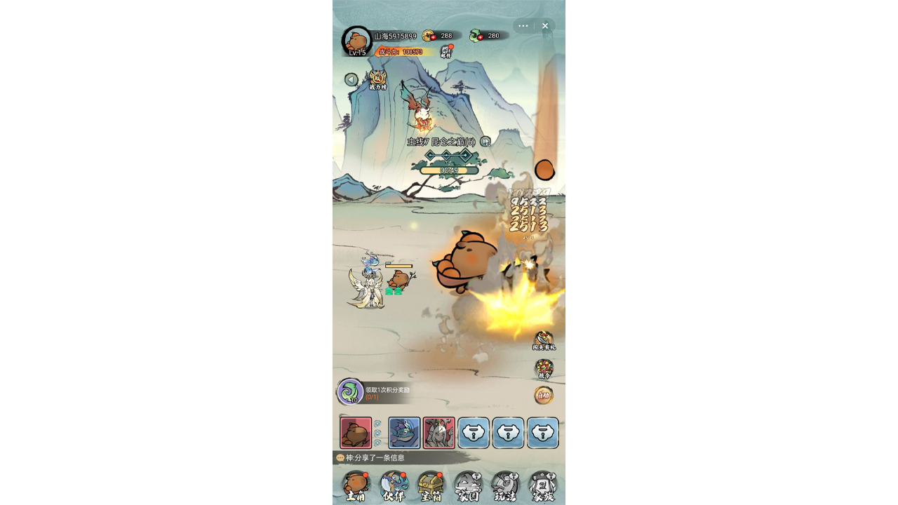 玩家通过依照主线任务指引,通过不断的开启宝箱获取装备金币与妖术等养成材料来提升玩家战斗力,同时还能招募山海经中的角色来协助玩家作战,主要进程为主线推图击败敌人,关卡难度会随着玩家的等级提升不断提升。通过合理的阵容搭配取得对战的胜利