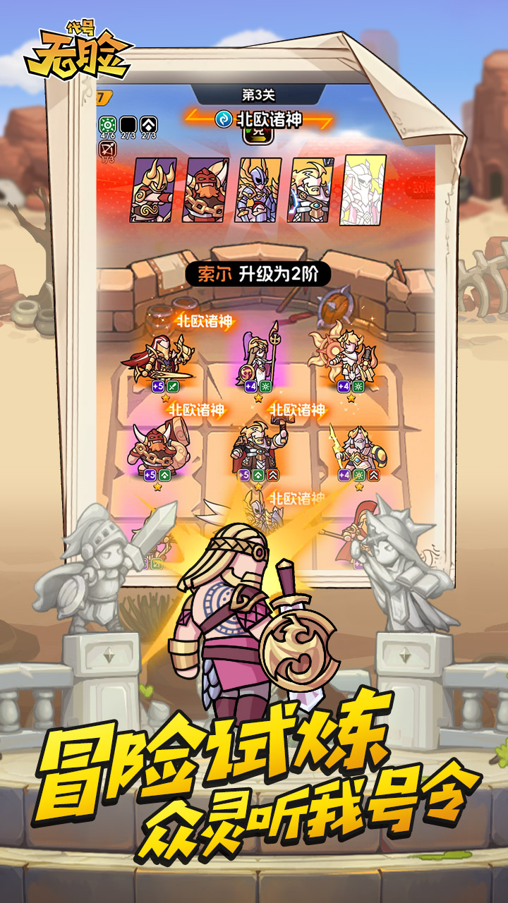 《代号:无脸》是一款竖版挂机打宝闯关的休闲策略游戏,在一片虚实交错的混沌异域中你将重建失落的神域。昔日光芒万丈的神灵将成为忠实可亲的伙伴,你们携手闯过混沌的迷雾,穿越星海而来不可名状的【他者】试图阻拦你的脚步,击碎他们,成为这不可驻世之地的王者吧!【惨,神仙也要当工作狂】掌握雷电的索尔竟然成为能源堡垒的核心,7*24小时不间断发电竟然还被投诉能量波动太大,流水线罢工停产,众多订单无法完成面临失业危机!妖艳美丽的美杜莎面对海量的混凝土订单焦虑脱发,这小城的建设生产怎么这么热火朝天!【忙,钓鱼种植还有挖矿】东海浪,西山霞,银钩一甩惊鱼虾。玄铁寒,灵玉滑,挖穿地脉见女娲。晨露凝,晚风飒,神仙土里种灵芽。【刷,装备宠物宝石全靠打】刷装备刷宝石刷强化刷秘法,刷到地下城的怪物见我闻风丧胆,刷到魔王的宫殿房倒屋塌。刷到四海龙宫大门紧闭,刷到野外没有一枚多余的金币。【抢,大地图资源先下手为强】野外领地争夺矿石原木,还有神秘奇遇解锁独占宠物。埋藏地下的宝物静等发掘,稀有的装备进阶图纸只需要轻轻地挥一挥锄头。【爽,其实是全自动放置休闲】管他北欧诸神罗马神话,统统拉来打群架!《奥丁》X《宙斯》组合正式出道,强力合击横扫一切臭鱼烂虾。钓鱼挖矿种灵植,委托英雄管理生产后,即可坐等自动收货,再也不用挨个消除红点,拢手喝茶岂不美哉?