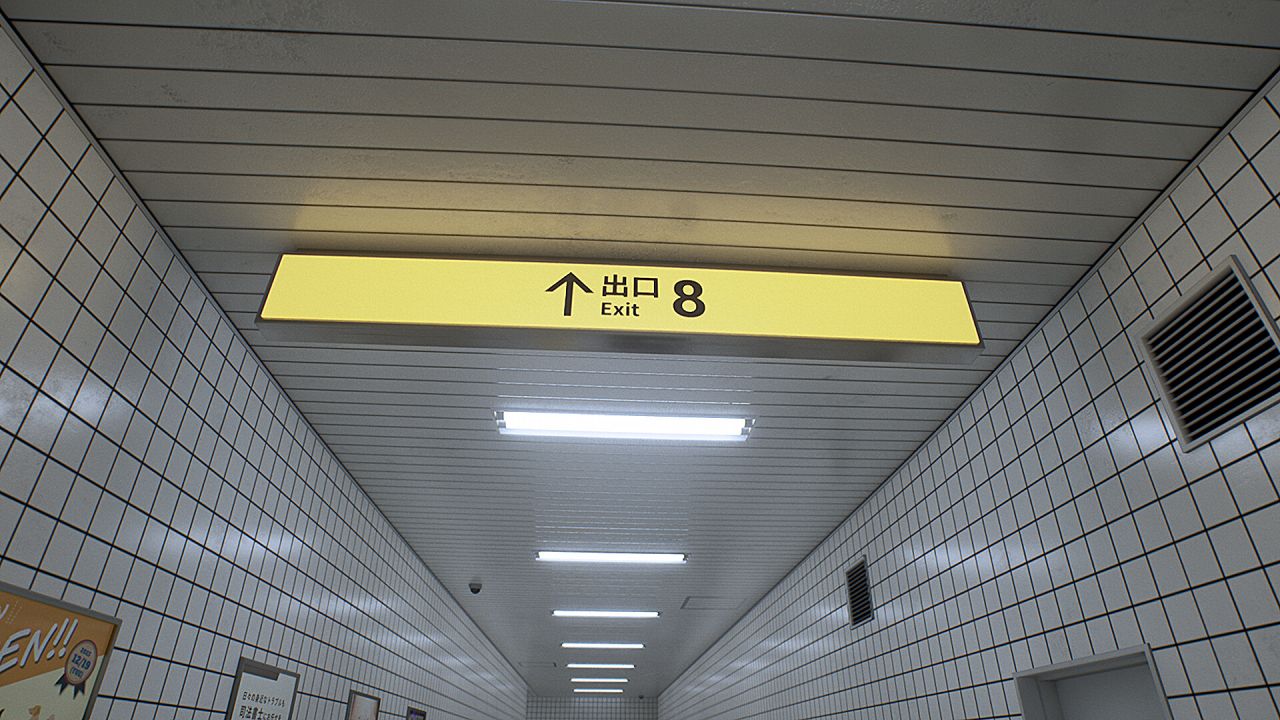 带有恐怖元素的第一人称视角步行模拟类游戏,以日本地下通道半密室空间为场景。玩家的目标是从8号出口离开,玩法的关键点为:当你发现异常时,需要立即转身。