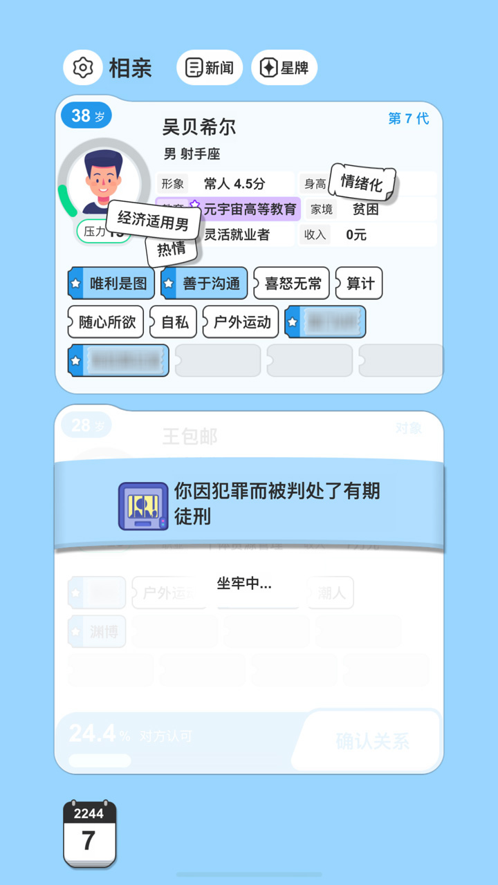 这是一个相亲市场模拟器你可以定制你的角色,然后投入相亲市场这里没有玩家与纸片人的甜甜恋爱,也没有普通人逆袭豪门的美梦有的只是残酷的条件对比与议价,只是人与人之间的互相贴标签尽量去找一个优质的对象吧,这样你的下一代才能遗传更好的条件随着时间的推进,世界背景也在悄然发生变化可相亲,仍在继续……直到某一代你再也找不到对象,游戏就结束了————————————————————轻度肉鸽,无尽模式,你能延续到第几代呢?