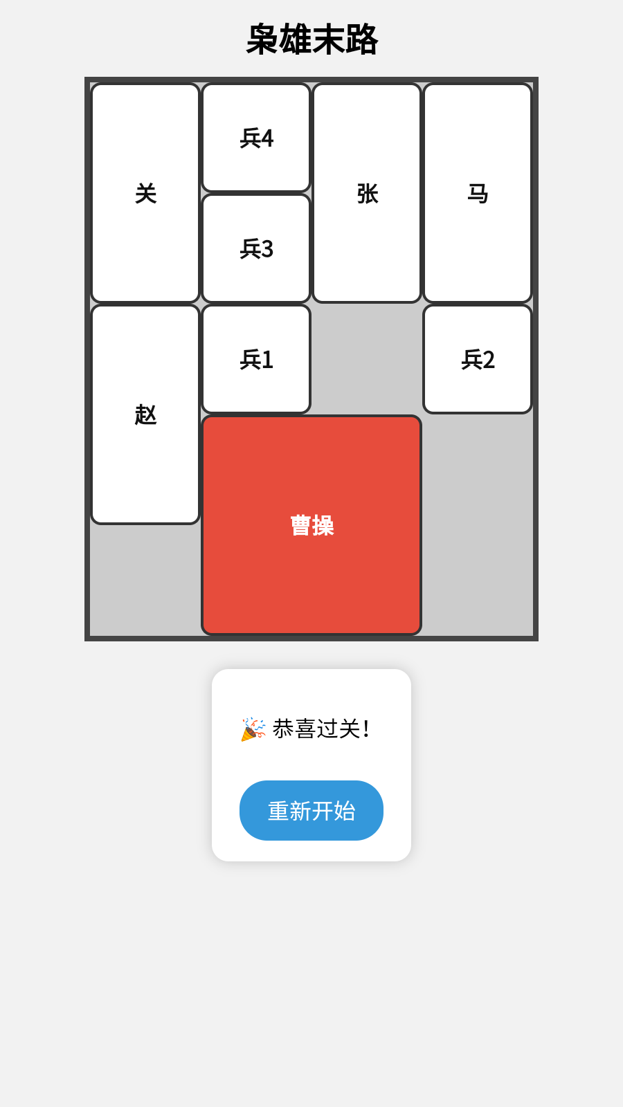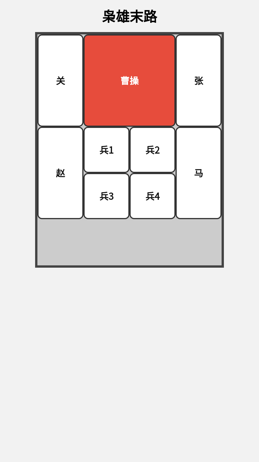 游戏玩法简介:红色方块为“曹操”,目标是将它移动到底部中间((1,3))。其他小块是阻挡物,不能穿透。点击并拖动可移动方块,若目标位置合法则方块移动。布局为 4×5 格子,部分方块为 2格大小。