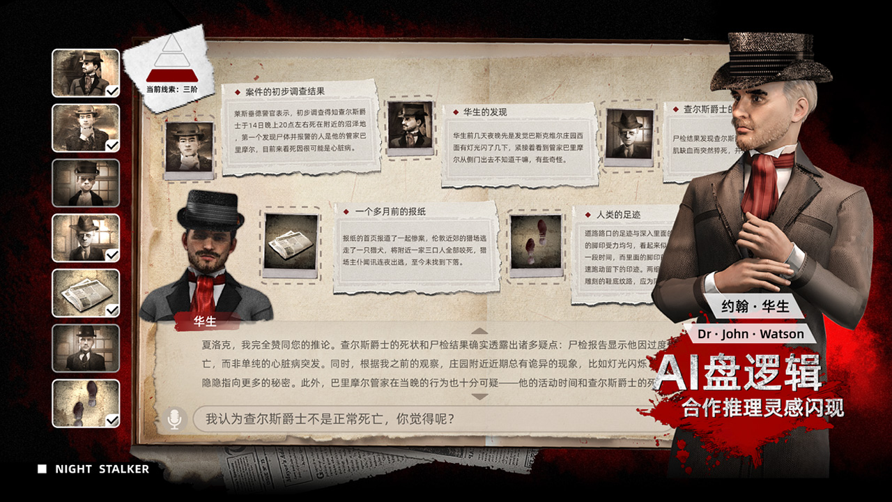 “当排除了所有不可能性,剩下的无论多不可能,都是真相。”——夏洛克 · 福尔摩斯。本作是一款由最新AI大模型技术打造,拥有全新交互体验的沉浸式悬疑推理游戏。化身福尔摩斯的你,将与AI扮演的数十个人物斗智斗勇,找出线索,破解谜题。游戏内没有任何剧情选项,所有的线索都将由你——远近闻名的大侦探亲自通过与故事人物攀谈、审讯、情绪引导、探索、解谜等手段来获得。无论重要角色还是次要角色都拥有自己完整的人设、背景、经历和人物关系,并能对你的提问实时做出情绪化的表情和回复,前所未有的沉浸感仿佛穿越到了19世纪的维多利亚女王时代,而你——就是那个唯一能改变结局的“大侦探福尔摩斯”。(注:本作中所有美术素材不涉及AI生成制作,仅文本、语音、规则逻辑由AI实时生成。)【游戏剧情】19世纪的伦敦郊外,浓雾笼罩着神秘的巴斯克维尔庄园,查尔斯·巴斯克维尔爵士的尸体被发现在附近的沼泽,尸体睁大着双眼右手紧抓胸前,一副死不瞑目的样子,却没有明显外伤,现场周围有大型犬类动物出没的痕迹。“一定、一定是巴斯克维尔家族的诅咒,那个传说中的魔鬼猎犬又出现了!”“难道我还是逃不过这家族的诅咒吗?不、我不想死……啊——”庄园内谜影重重,庄园外危机四伏,未知的恐惧如同恶魔之手紧紧扼住每个人的喉咙令人无法喘息。福尔摩斯受好友莫德的邀请来到巴斯克维尔的庄园后,又接二连三的发生了新的命案,沼泽内新发现的残缺尸体、隔壁庄园喷泉中死亡的女尸……这些看似不相关的案件之间,到底是否存在某些联系?巴斯克维尔家族的诅咒又有什么隐情?随着案情的逐步推进,真相逐渐浮出水面,原来——“夏洛克,你曾说巴斯克维尔庄园的每一块砖石都在窃窃私语……但有些秘密,连泰晤士河的潮声也吞不下。”“所以需要更锋利的耳朵——比如某个坚持用手术刀切开圣诞布丁的医生。”【游戏特色】======AI飙演技!尔虞我诈因你生戏======“每个NPC都是奥斯卡影帝,说谎比呼吸还自然!”NPC角色不再是一串代码,而是被AI注入灵魂的“活人”——面对审讯强作镇定的神态、谎言被拆穿后急于自圆其说的话语、邻里八卦他人隐私的乐趣、互相推卸责任的嘴脸……AI让每个角色“活”成真人,你永远猜不透他们下一秒会帮你破案,还是捅你一刀!======AI有脾气!爱恨情仇等你攻略======“送错礼物分分钟绝交,NPC好感度比女友还难哄!”给医生送手术刀?他会夸你是知己;但给女士小姐送同款,可能被扇耳光骂“你在诅咒我!”AI根据每个角色的性格和情境做出实时情绪反应——脸红、愤怒、冷笑甚至掏枪,撩还是怼,全看你的求生欲!什么?送出去的礼物还能要回来?要命的是——你永远猜不到NPC会烧毁礼物,还是把它淬毒后寄回给你。暴雨夜门缝塞进的“回礼”,可能是沾血的情书,也可能是一枚刻着你名字的子弹。======AI盘逻辑!合作推理灵感闪现======“真相不靠剧本,而是与华生AI的脑域共舞!”把茶杯+药瓶扔给AI扮演的华生助手分析,立刻触发高能对话:华生AI助手:“夏洛克!药瓶里的粉末似乎和茶杯底部留下的渣滓成分相同!”福尔摩斯:“看来有人在我们的红茶中下了药。这就是你昨晚想要囚禁我的真相呢!”不用查攻略,AI带你躺赢推理!======AI神反转!解锁多重隐秘结局======“你以为抓住凶手就是终点?AI正在幕后笑你天真!”指认Ta是真凶?第二天报纸头条可能变成《福尔摩斯身败名裂!栽赃丑闻曝光》。而若选择隐瞒关键证据,十年后街头会闪过“已故”男爵的诡笑……AI会根据你的话语、完成的任务、获得的线索和道具,将剧情掰向不同结局——包括那条让柯南·道尔都惊坐起的隐藏线:【涉及剧透数据已删除】。——嘘,你听见沼泽深处的犬吠声了吗?