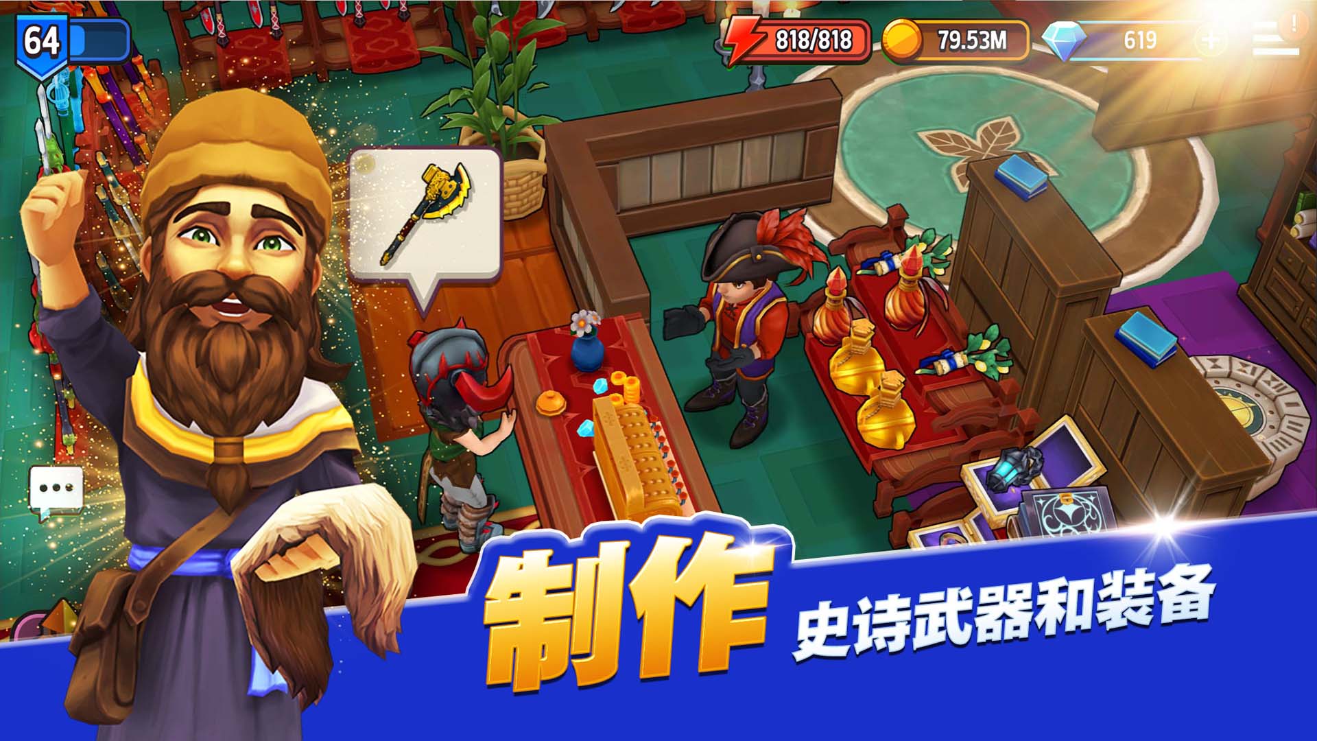 作为新兴冒险者城市中一位勤奋努力的新店长,该撸起袖子开工啦!精心制作、讨价还价、售卖货物,一路登顶,定能吸引各种各样丰富多彩的角色光临您的店铺……没准连国王都会赏光呢!打造您自己的店铺定制您的店铺:地毯、货架与摊位……或者加上一大堆猫咪雕像!设计出您梦中的商店,让顾客们纷纷爱上您的店铺吧!以貌惊人:在数十种发型、服装与配饰中进行选择,让您的店长充满个性!开始制作制作:可以制作的物品会不断增加,包括刀剑、护盾、靴子、枪械,等等等等!升级:成为大师级工匠。制作的物品越多,物品就变得越强,价值也随之提高。附魔:使用强力元素与精魂为任意物品进行附魔,唤醒物品中蕴藏的真正力量。可能的组合超过一百万种!召集英雄,进行冒险,收集战利品定制您的小队:招募并定制来自18个不同职业的各路英雄,为他们装备由您打造的物品!结交勇士:让您的英雄与独特而强力的勇士们组队出征,了解这些角色背后的强大技能与独特故事。对抗怪物:派出英雄小队与怪物战斗,获得珍贵的制作材料!巨大的多人游戏世界加入公会:与其他玩家组队,一起投资,创建蓬勃发展的城市!联手组队:在“失落的黄金城”等活动中,与您的公会一起竞技。随着进度的不断推进,您将获得大量奖励。玩转市场:投身于世界各地玩家经营的市场之中,获得大量黄金(还有宝石)!