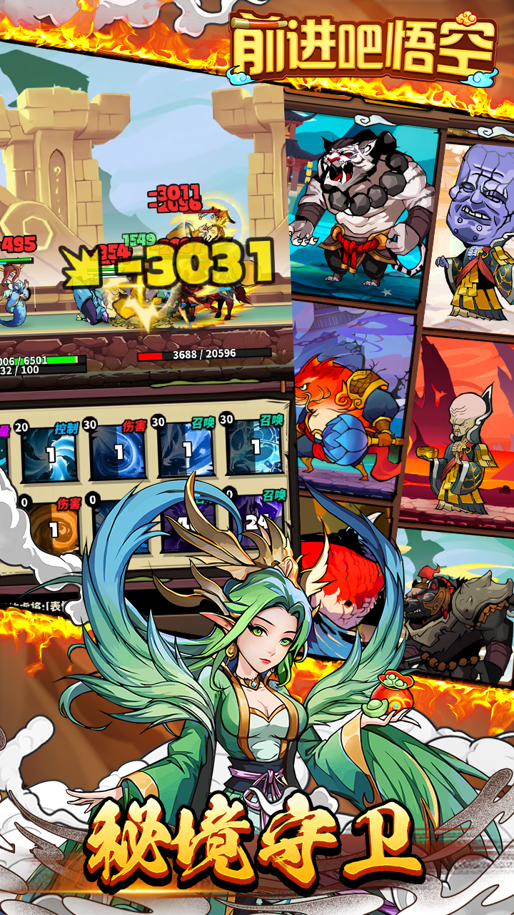 《前进吧悟空》是一款带技能操作的放置挂机卡牌游戏,可以策略手动操作,也能轻松自动推图。【组队-三人组队,击杀妖王】跨服三人组队,挑战技能各异的强力boss,根据boss的技能,可以选择不同职业的队友组队击杀,斩获稀有的极品宝戒,被动技能书【秘境-各路妖王盘踞一方】上百种造型各异的妖怪,守护秘境,等你来战,击杀妖怪,获得各类极品套装,还能获得一次性掉落的珍贵藏品【策略-技能神通法宝,超多搭配】每个主角都有独特的技能系统,更有三系神通让你体验完全不一样的发展路线,还可以搭配不同的被动技能、特色法宝强化技能效果【伙伴-特色强力帮手】几十个伙伴都有拥有特色技能系统,技能会在战斗中自动释放,战斗可以携带两个伙伴,根据主角以及主角的神通路线,可以选择最适合的伙伴进行搭配,更有特色的伙伴竞技场,搭配伙伴阵容一较高下