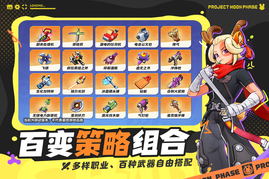 《月相计划》是一款融合涂色对抗+肉鸽+弹幕射击的多人对战游戏。游戏为八人对战模式,玩家乘坐载具前往竞技场,每局分别进行两两对决。玩家的载具初始有 100 点耐久,每局结束败者会扣除耐久值,耐久值归零即被淘汰。