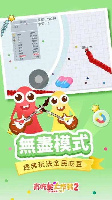 經典國民療癒遊戲《貪吃蛇大作戰2》驚喜回歸! 經典貪吃蛇全面升級!曾經火爆的Snake Off歸來! 年度最佳休閒競技遊戲,不僅比拼手速,更考驗你的策略! 每個人都是一條小小蛇,只有不斷的吃下身邊豆子,同時運用你的智慧,設計你的對手吸收他的能量,讓你小蛇變大蛇,一步步成長為長蛇王唷。 小小蛇的玩法也更加充滿創新,蛇蛇世界還迎來更多新朋友!通過社交板塊認識更多新朋友,一起成為蛇王,擊敗敵人! 更有花樣豐富款式新穎的皮膚,炫酷多彩挑花你的眼睛!