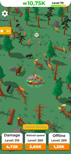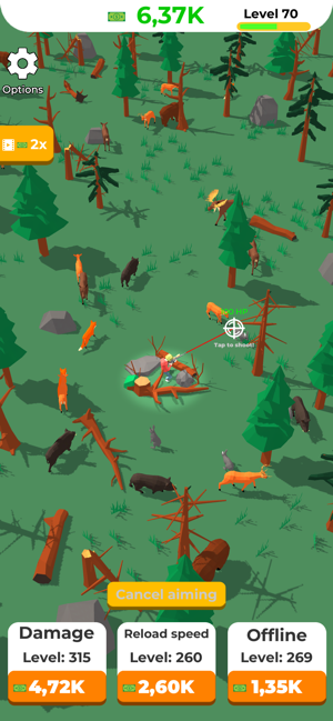 闲置的狩猎是一款3D视角的卡通画风的非常有趣的射击游戏,游戏名为闲置的狩猎,在这款游戏中玩家这一次要扮演的就是一位猎人,你要做的事情就是用你手中的武器去捕获你的猎物。闲置的狩猎这款游戏作为一款FPS游戏而言游戏的难度算不上很高,玩家所使用的枪械也没啥后坐力之类的说法。