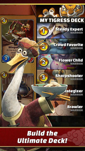 此前已经有多款《功夫熊猫》类型的游戏,但是主要还是以MMORPG类型为主,卡牌对战游戏本作还是第一款。既然动画电影如此受欢迎,那么选择延续电影的画风就一定不会是一个错误的选择,所以在本作中我们可以看到大量的动画电影中的元素,除了制作精美的卡通风格的画面之外,阿宝、盖世五侠等主角人物也将悉数登场,而小镇上的群众也将在对战中展现出自己的作战实力,而这些是在电影中所看不到的。