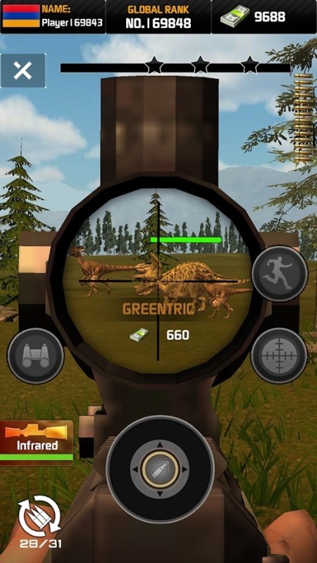 射击野生恐龙是一款相当好玩的生存射击游戏,玩家在游戏中会化身为一名猎手去猎杀各种恐龙,在这个神奇的游戏世界之中,恐龙是随处可见的,当你发现目标之后就可以直接开火,用最快的速度帮助自己快速完成任务,领取狩猎奖励收集更多的金币,用你绝佳的射击技术将它们完全杀死,快来下载体验吧!