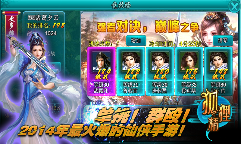 2014手机网游《狐狸精》是一款角色扮演游戏,取材自妲己祸世纣王暴政,姜子牙寻找天命之人助周王伐纣的故事,游戏剧情跌宕起伏,游戏画面精致唯美,游戏玩法丰富多彩,游戏活动层出不穷,一玩就上瘾,根本停不下来!