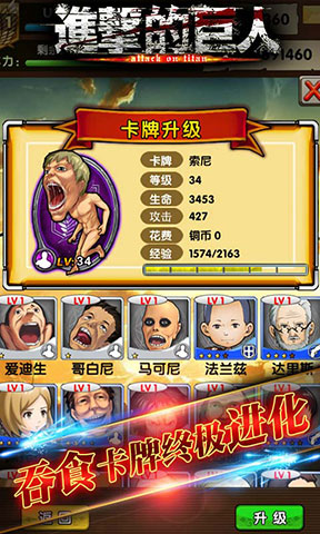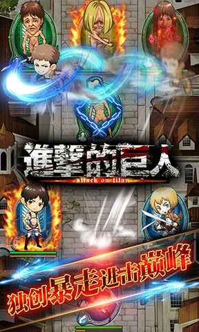 《进击的巨人》是一款为内心所渴望的自由和平而战斗的卡牌手游。在游戏中,人类所居住的地方被入侵,你流离失所,饱受苦难,亲人遇害, 当你眼睁睁的看着身边的人一个又一个的离去, 当昔日温暖的家变成一片废墟, 你能做什么?马上拿起武器,组建自己兵团吧!“驱逐所有巨人”不仅成为了艾伦生命的支点也同样成为了整个游戏的信念。去战斗,不停的战斗,和你的朋友们一起排兵布阵,考验智慧!你将与万千强力小伙伴相遇,收纳他们,并肩作战!你将渐渐成长为尖兵统帅将不同属性、不同能力的小伙伴组成精兵阵型,应对千奇百怪的巨人进攻。