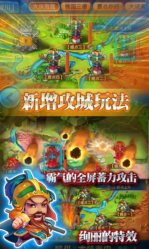 2D界面让卡牌游戏不在无聊生硬,超Q超萌的卡牌形象更是让人乐趣横生。游戏中征讨系统、夺宝系统以及讨伐系统等,让玩家交互乐在其中,独特的军团系统助力拉拢人心逐鹿中原,一统三国!