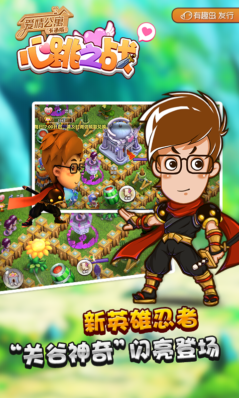 《心跳之战》由爱情公寓官方授权、玄鼎网络开发、有趣岛独家代理运营。本游戏秉持高品质路线,不仅为玩家设计了九大英雄人物,还丰富了英雄的养成功能,提高了策略塔防的多样性玩法,更增加了有趣的任务系统。以魔幻混搭卡通Q版造型的游戏风格让无数妹纸们湿声尖叫,欲罢不能,爱到无限!还等什么?挑战全球排行NO1,我们看好你哦!