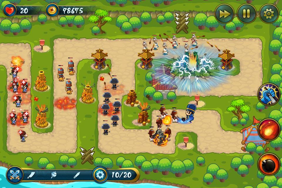 战斗中地图塔位设计更加合理,路径设计更具变化性,您必须充分合理的使用每一个位置,您将真正感受到塔防玩法的精髓。从步兵 枪兵 盾兵 战车 神隐到各种骑兵 御剑仙人 风筝勇士再到具有浓郁地方特色的尸魔将,象兵,多达30余种的兵种数量,属性更多 兵种技能更多,随着游戏进度逐关解锁,挑战更多、乐趣更多。陆战、水战、空战,一样都不能少,真正让你享受到“战国”时代的海陆空大混战。