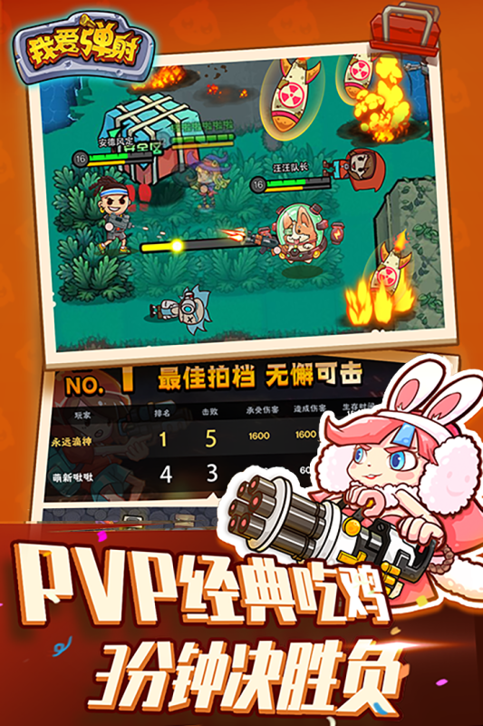 主打3分钟双人吃鸡玩法,丰富的枪械及道具,依据有利地形和随机掉落道具,与队友一起团灭对手吧!