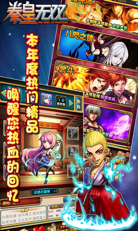 2014最精美超萌的卡牌手游《格斗无双》绚丽来袭!游戏将趣味呆萌的Q版画风、酷炫爽快的战斗画面、忠于拳皇的RPG剧情风格于一身,是一款改编与创新相结合的游戏!