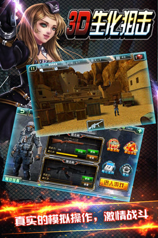 《3D生化狙击》是一款全新的第一人称视角射击游戏, 本作不仅全面加强了游戏的画面质感、武器、人物、场景等细节,还增加了全新的生化模式,无边无尽的尸海狂潮,爽快无边的超爽打击!尽在《3D生化狙击》,最好玩的手游CF,快来一起狙击吧! 1.增加新枪试用功能 2.增加特殊玩法