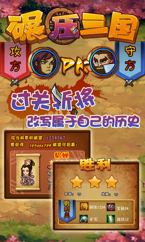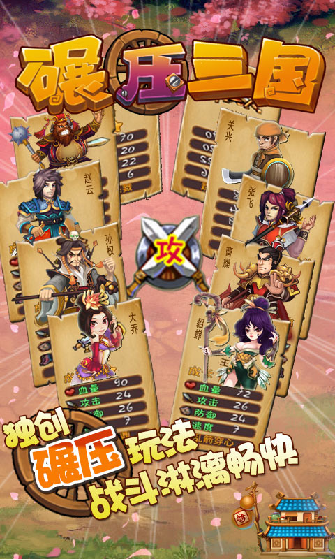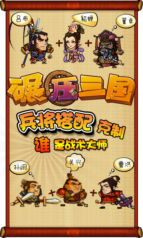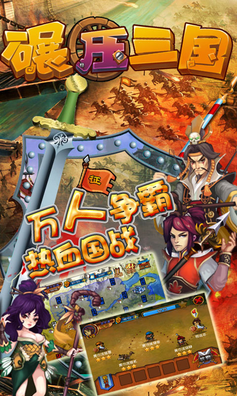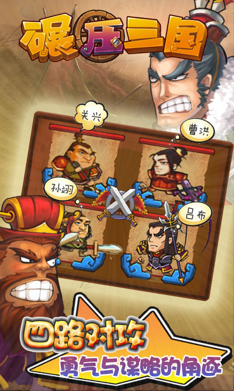《碾压三国》是一款萌风格的RPG策略类手游。新颖的四路横向碾压战斗,兵呆将萌,怪傻钱多。三国大战,万人同台,群雄逐鹿,成就霸业!