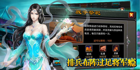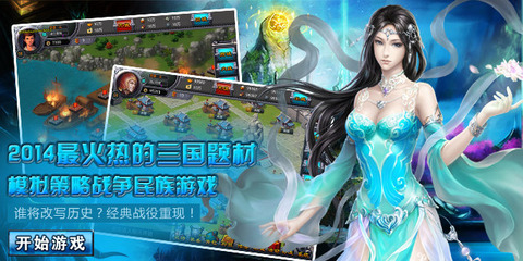 2013年最火爆战争策略型手机网游,经典三国题材游戏,华丽精美的画面,强悍的视觉冲击。让你体会到前所未有的战斗体验。通过不断作战、征兵招将,建立属于您自己的三国军团。 游戏里,您是智勇双全的军师,随着剧情发展即时遇敌,300多个耳熟能详的三国名将任您做主,魏蜀吴三国名将首度聚齐,百万人同服PK、攻城,N多关卡战役,战术策略在指掌间淋漓体现。推图,刷野地,掠夺玩家城池,联盟战、国战,精妙谋略布阵让您充分体验到乱世英雄争霸的快感!