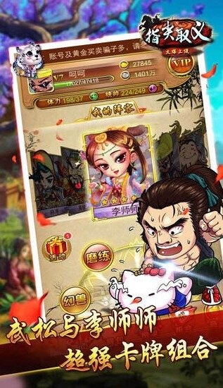 《指尖取义》国内首款Q版、萌,可爱的水浒英雄卡牌游戏。首创卡牌幻兽系统,让可爱、Q萌的幻兽陪您共同作战。创新玩法,实时参与战斗。创新的在卡牌游戏中引入了幻兽,您可以通过幻兽技能,实时参与战斗,从而改变战斗结果。新颖的游戏内容,猎场、摇骰子等。辅助的各种新颖玩法,各种新颖的游戏体验。喜欢的玩家,赶快下载吧!
