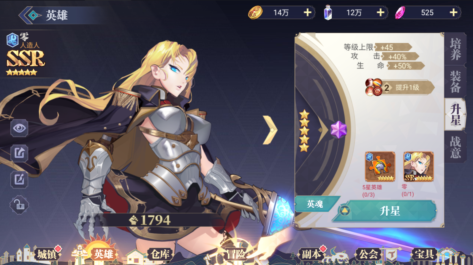 R英雄只能升到5星、SR只能升到9星、SSR能升到15星;英雄分血裔、学院、精灵、神族、魔族,升星要消耗英雄卡,同英雄就是本体,其他英雄就是狗粮,三系英雄升星都消耗本系的英雄,神魔除本体外可以全部吃5系英雄狗粮。